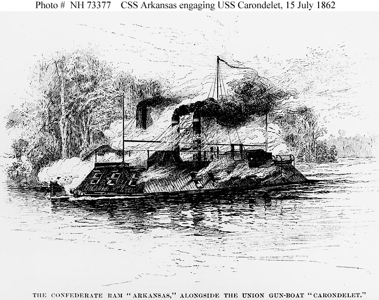 On 15 July 1862, Lieutenant Brown took Arkansas boldly down the Yazoo River where he soon encountered three Union warships, the gunboats USS Carondelet and USS Tyler, and the ram USS Queen of the West. Arkansas did not hesitate and quickly attacked the superior force. First, Arkansas neared Carondelet, Commander Henry Walke, USN, in command. Arkansas scored several hits on Carondelet’s unprotected stern, severely disabling the ship and forcing it to run aground to prevent her from sinking. Arkansas then turned her attention to Tyler, which was near the stricken Carondelet. The two ships traded shots, but Arkansas inflicted substantial damage to Tyler, forcing her to retreat with many casualties.